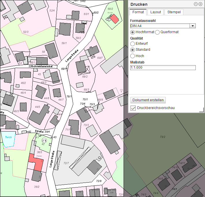 Mit diesem Werkzeug können Sie einen maßstabsgetreuen Kartenausschnitt als PDF drucken. Ihnen stehen verschiedene Einstellmöglichkeiten für den Druck zur Verfügung.