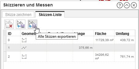 Die Funktionen zum Exportieren von Skizzen steht in der Skizzen-Liste im Werkzeug "Skizzieren und Messen" zur Verfügung.