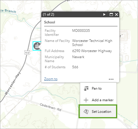 - Klicken Sie auf ein vorhandenes Feature, um dessen Pop-up anzuzeigen. Klicken Sie dann auf die Schaltfläche für weitere Informationen, um eine Liste der Feature-Aktionen anzuzeigen, und wählen Sie Position festlegen aus.